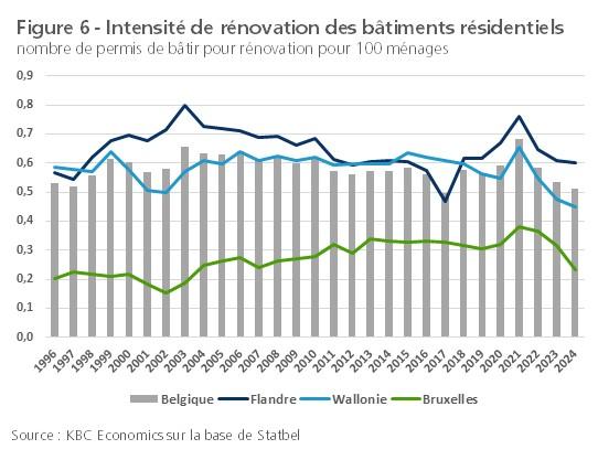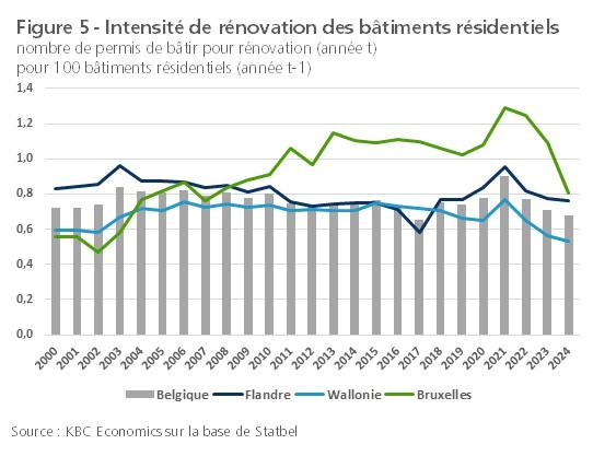 Après la pandémie, l'intensité de rénovation a considérablement diminué. Cette baisse est conforme à la forte contraction généralisée des investissements des ménages dans les bâtiments d'habitation (nouvelles constructions et rénovations), comme le montrent les chiffres des Comptes Nationaux. L'une des principales raisons est sans aucun doute le choc des taux d'intérêt, qui a fait grimper les taux hypothécaires. Le recul de l'intensité de rénovation s'est marqué dans les trois Régions. Sur une période plus longue, l'intensité de rénovation en Flandre est en moyenne légèrement supérieure à celle de la Wallonie depuis 2000. Par ailleurs, en Wallonie, en dehors du pic pandémique, on observe une légère tendance à la baisse depuis 2015. Bruxelles s'écarte considérablement des autres Régions, ce qui s'explique par le fait que les ménages y sont relativement plus nombreux à vivre en appartement et que ce que nous considérons ici comme un immeuble résidentiel consiste plus souvent en un immeuble à appartements comprenant plusieurs unités d'habitation.