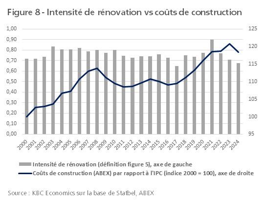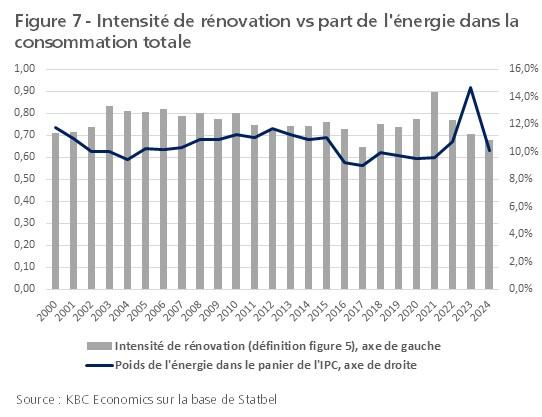 Le fait que l'intensité de rénovation n'ait pas augmenté, malgré les incitations des pouvoirs publics, est lié à des forces contradictoires et à certains obstacles. On fait souvent référence à un renchérissement de l'énergie qui obligerait les ménages à entreprendre des rénovations énergétiques. Les prix de l'énergie ont certes augmenté au cours des vingt-cinq dernières années, mais la part de l'énergie dans la consommation totale des ménages est restée relativement stable, à 10-12 %, au cours de cette période (à l'exception du pic enregistré pendant la crise énergétique, voir figure 7). Par conséquent, d'un point de vue financier, les ménages dans leur ensemble n'ont peut-être pas ressenti suffisamment le besoin de procéder à des rénovations. D'autre part, les coûts de construction ont fortement augmenté par rapport aux prix globaux à la consommation (voir figure 8). Le coût élevé de la rénovation, associé à des normes de durabilité plus strictes et à des retours d'investissement (potentiels) parfois assez longs, a constitué un obstacle financier au lancement d'un projet de rénovation. Selon une étude réalisée par Essencia en 2019, plus de la moitié des personnes interrogées n'ont pas réalisé de travaux d'économie d'énergie parce qu'elles n'en avaient pas les moyens. Plus d'un tiers d'entre elles estiment que la rénovation coûte plus cher qu'elle ne rapporte.