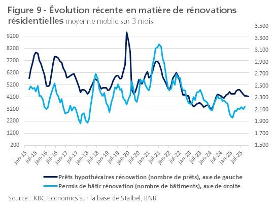 Pour estimer les dernières tendances en matière de rénovation des bâtiments résidentiels, nous nous basons sur des chiffres mensuels. À la fin de l'année 2024, le nombre de permis de rénovation octroyés était tombé à un niveau exceptionnellement bas. Depuis lors, ce nombre a légèrement augmenté, sans que l'on puisse vraiment parler d'une reprise visible (voir figure 9). Le nombre de prêts hypothécaires accordés par les banques pour la rénovation a rebondi un peu plus nettement depuis le début de l'année 2024. Cela inclut les projets de rénovation, qu'ils soient ou non liés à l'achat du bien. Le nombre de prêts hypothécaires sollicités auprès des banques pour des travaux de rénovation (non indiqué dans la figure) a également connu un léger rebond. En ce qui concerne le montant des prêts hypothécaires accordés pour la rénovation (en euros, non indiqué dans la figure), on observe une reprise plus nette, ce qui indique une hausse des montants empruntés par projet.