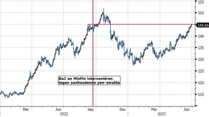 De Japanse yen ervaart ondertussen de pijn van het lange wachten terwijl de rest van de wereld al lang aan het verstrakken is. De munt staat sinds enkele maanden opnieuw onder sterke neerwaartse druk, zowel tegenover de euro (EUR/JPY 157, een 15-jarige top) als de dollar. USD/JPY nadert de 145. Op dit niveau intervenieerde het Japanse Ministerie van Financiën en de Bank of Japan in september vorig jaar om het verval van de munt toen een halt toe te roepen. Zonder veel succes want in de maand daarna zette USD/JPY een piek van 150 neer. Ook vandaag klinken de dreigementen van FinMin Suzuki luider en duidelijker: hij ziet een plotse en eenzijdige positionering op de markt. Is dit de laatste waarschuwing richting de markt?