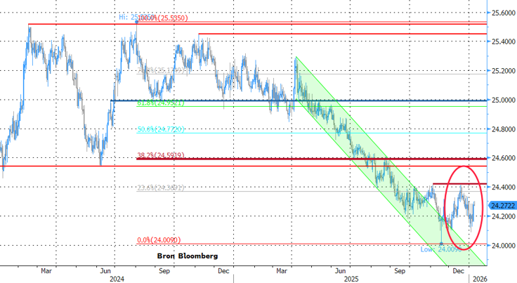 De eerste schatting van de inflatiecijfers voor december die gisteren bekend werden gemaakt suggereren dat dit patroon nog even kan aanhouden. De inflatie klokte af op -0.3% m/m en 2.1% j/j (2.3% verwacht). Toegegeven, het milde cijfer kwam vooral op conto van voedsel- en energieprijzen. De diensteninflatie (0.2% m/m en 4.8% j/j) blijft veel hoger dan CNB eigenlijk wil. Begin dit jaar kan de inflatie wel verder afkoelen beneden de 2%-doelstelling (KBC verwacht 1.6% in januari) onder meer omwille van de temperende impact van gereguleerde energieprijzen. Op zich hoeft dit niet onmiddellijk te leiden tot bijkomende renteverlagingen, maar de markt gelooft wel opnieuw dat het kan. De 2-j rente daalde gisteren 7 bpn tot 3.47%. Begin december schreven we hier nog 3.8%! Recente commentaren vanuit de CNB doen ook weinig om de rentecorrectie een halt toe te roepen. Zwijgen is toestemmen. Op zich hoeft een beperkt verlies aan rentesteun omwille van lagere inflatie niet dramatisch te zijn voor de munt. De combinatie van een iets mildere inflatie en een mindere uitgesproken communicatie van de CNB namen de kroon ondertussen wel de wind uit de zeilen. De zone EUR/CZK 24.00 dient zich op korte termijn aan als een sterke steun (weerstand voor de kroon). EUR/CZK 24.40 markeert de top van een korte termijn consolidatiepatroon. In geval van een breuk biedt de zone 24.55/60 zich aan als een volgende technische referentie (38% correctie sinds top EUR/CZK 2024/low 2025, zie grafiek).
