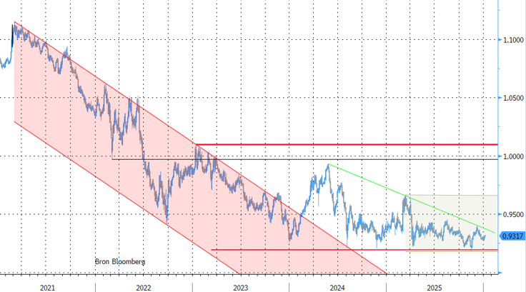Sinds de zomer van 2024 is de beweging in EUR/CHF uiterst beperkt. Zelfs als we rekening houden de met de volatiliteit in maart (euro-opsprong naar aanleiding van Duitse fiscale stimulus) en de risk-off tegenbeweging in april, zit de combinatie gevat in een band tussen 0.918 en 0.967. Sinds april is de corridor zelfs nog nauwer (0.918/0.946). Zeer beperkte volatiliteit dus. Hoewel de munt historisch gezien sterk blijft, kan de Zwitserse centrale bank (SNB) waarschijnlijk best leven met dit ietwat saai status quo.