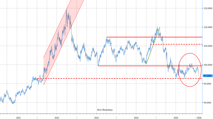 Data blijven waarschijnlijk van eerder secundair belang. In de VS staan deze week orders voor duurzame goederen (vandaag), consumentenvertrouwen (dinsdag) werkloosheidsaanvragen (donderdag) op de agenda. Interessant maar geen ‘gamechangers’. De belangrijke maandelijkse update in de VS, inclusief payrolls, volgt volgende week. Ook hier kijkt de politiek overigens opnieuw mee over de schouder. Naar aanleiding van de spanningen in Minneapolis dreigen de Democraten hun steun op te zeggen voor een financieringspakket van de Amerikaanse overheid. Dat kan na 31 januari eventueel leiden tot een nieuwe (gedeeltelijke) shutdown die ook de publicatie van economische data in de VS opnieuw kan verstoren. Wordt vervolgd. De Amerikaanse schatkist veilt deze week obligaties met kortere looptijden op twee, vijf en zeven jaar. Het blijft interessant om de interesse van de markt te zien na de recente Sell America oprisping, al spitst het debat over risicopremies zich vooral toe op het langere eind van de rentecurve. Op de wisselmarkt is het uitkijken naar (gecoördineerde) interventies vanuit Japan en (eventueel de VS) om de zwakke yen te ondersteunen. Dit bevindt zich uiteraard op de grens tussen politieke en economische marktdynamiek. Ondertussen trekt de correctie in de USD/JPY-combinatie de dollar wel verder omlaag. Eerste belangrijke steunniveaus komen in het vizier.