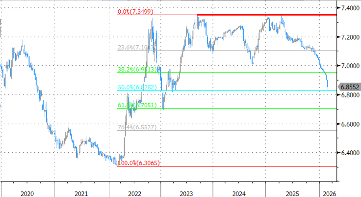 Chinese autoriteiten hielden zich lang afzijdig maar nemen nu toch de eerste maatregelen. De fixing vanmorgen was bijvoorbeeld aanzienlijk zwakker dan verwacht. Het verschil met de consensus was zelfs de grootste ooit. Daarnaast verlaagde de PBOC de kost voor investeerders om te speculeren op een zwakkere munt. Het zijn relatief brave maatregelen die suggereren dat China vooral de stijging wil afremmen eerder dan dat het CNY-zwakte nastreeft. De markt is niet bepaald onder de indruk. USD/CNY handelt nog steeds nabij de meerjarige toppen in de buurt van 6.85.