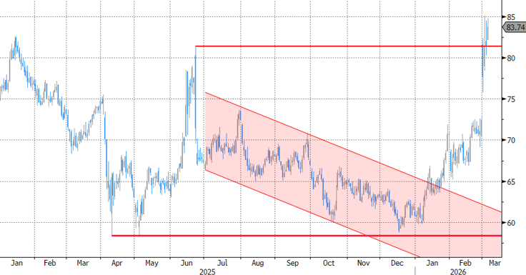 Toch is het te vroeg om victorie te kraaien. Op één bepaalde, cruciale, deelmarkt is er nog geen sprake van een ommekeer. De olieprijs stijgt voort. En laat energieprijzen nu net de naald in het marktkompas zijn tijdens de eerste dagen van het conflict in het Midden-Oosten. De prijs voor een vat Brent ruwe olie bedraagt momenteel $84, ten opzichte van niveaus net boven $70 vorige week. Een verstoord aanbod ligt uiteraard aan de basis. In eerste instantie omwille van de uitval van Iraanse productie en omdat olietankers vastzitten in de Perzische golf door het gevaar rond de Straat van Hormuz, de noodzakelijke strategische zee-engte die het vrachtverkeer door moet. Naar schatting kan zo’n 25% van de olie-output via leidingen over het Arabische schiereiland alsnog de golf verlaten. Hoe langer het conflict aansleept, hoe groter de olie-uitval wordt. Landen zoals Irak en Koeweit bereiken na respectievelijk drie en veertien dagen (na 3 maart) hun maximale binnenlandse opslagcapaciteit. Irak schakelde al snel over naar het oppompen van ongeveer 2/3e van de normale hoeveelheden om een beetje tijd te kopen. Israëlische en Amerikaanse insinuaties dat het conflict weken kan aanslepen, suggereren dat de energie-aanbodschok langer kan duren. Voor (activa van) netto energie-importeurs geeft dat weinig perspectief op een snel herstel. Denk bijvoorbeeld aan de euro. Voor Europa spelen de gasprijzen een minstens even grote rol in het verhaal. Ze ontkoppelden gisteren van de olieprijs. Het relatieve aandeel LNG dat de golf verlaat is kleiner dan dat van olie. De kans dat er een spreidstand ontstaat tussen stijgende olieprijzen en dalende gasprijzen is klein. Er zijn eerste signalen van tankers die op zee rechtsomkeer maken omwille van betere prijzen elders. Europa kan bovendien niet achterblijven in een eventueel prijsopbod omdat gasreserves bijzonder laag zijn voor de tijd van het jaar en ze nu moeten aangevuld worden voor de volgende winter.