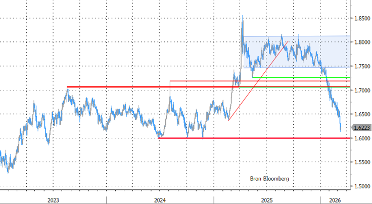 Het vooruitzicht op bijkomende rentesteun in een context van degelijke economische groei, samen met ruime beschikbaarheid van grondstoffen en energie, waren de voorbije maanden duidelijk troeven voor de Aussie dollar. Tot voor kort was de Australische munt zeer gevoelig voor algemene volatiliteit en negatief risicosentiment. Dat is nu veel minder het geval. De munt is te klein om een globale rol als vluchtmunt te spelen, maar is nu blijkbaar toch minstens een diversificatie voor wie twijfelt over de dollar als toevluchtsoord in onzekere tijden. Er was/is een kleine risk-off aarzeling sinds vorige week, maar de AUD/USD-combinatie houdt ondertussen wel stand boven de psychologische kaap van 0.70 (nu 0.712) en botst aan tegen de beste niveaus sinds midden 2022 (nota bene tegen een sterke dollar!!). De (door energie gekwetste) euro kan al helemaal niet volgen. EUR/AUD dook van niveaus boven 1.80 in oktober tot EUR/AUD 1.62 nu. Een breuk beneden 1.60 zou een bijkomend technisch signaal zijn.