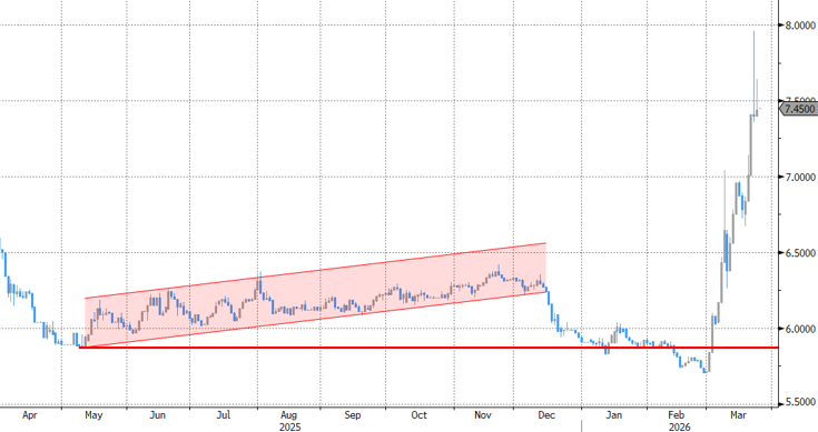 De Hongaarse centrale bank hield de beleidsrente gisteren ongewijzigd op 6.25%. De context van de meeting was dag en nacht verschil met die van februari, waarop de MNB voor het eerst in bijna anderhalf jaar de rente met 25 basispunten verlaagde. De centrale bank tankte toen vertrouwen na gunstige inflatiecijfers in januari (2.1% j/j en 2.7% j/j voor onderliggende kerninflatie). De jaarlijkse prijsaanpassingen in de dienstensector waren de kleinste sinds een lange tijd en sterkten samen met onder meer een verlenging van beperking op winstmarges en een sterkere forint het vertrouwen dat inflatie de komende maanden beneden 3% zou blijven. In februari zette de disinflatietrend zich trouwens voort tot respectievelijk 1.4% en 2.1% voor hoofd- en kerninflatie. Het conflict in het Midden-Oosten gooit ook hier roet in het eten via energieprijzen. Waren de groei- en inflatierisico’s vorige maand nog gebalanceerd, dan schuiven die nu naar neerwaartse economische en opwaartse prijsrisico’s. Nieuwe groeiprognoses voor dit en volgend jaar bedragen 1.7% en 3% ten opzichte van 2.4% en 3.1% in december. Voor inflatie verwacht de centrale bank nu gemiddeld 3.8% voor 2026 en 3.7% voor 2027 (van 3.2% en 3.3%). In de huidige economische omgeving blijft het handhaven van de financiële stabiliteit—lees: forint—cruciaal voor het verankeren van inflatieverwachtingen en het bereiken van prijsstabiliteit. Daarom zweert de centrale bank de volgende maanden bij een voldoende restrictief monetair beleid met een positieve reële rente. Hongaarse rentemarkten namen sinds begin maart de vlucht vooruit. Het korte eind van de swaprentecurve steeg van 5.75% tot net geen 8% op maandag en zoekt nu een korte termijn evenwicht rond 7.5%. Ze gelooft dat de MNB bakzeil zal halen op de februaribeslissing en de kaart van renteverhogingen zal trekken. De volatiliteit in EUR/HUF is hoog, maar 395/400 bleef nog buiten schot in een voorlopig teken van vertrouwen naar het monetaire beleid toe.