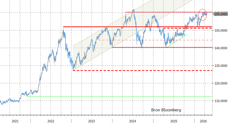 De yen heeft het al langer (zeer) moeilijk en onder meer de energiecrisis helpt niet. Verdere verliezen worden op dit ogenblik vooral ‘beperkt’ door terughoudendheid van marktparticipanten om de rode (stippel?)lijn voor eventuele FX-interventies nabij de psychologische kaap van USD/JPY 160 echt aan te vallen. Ondertussen gaat die Japanse munt wel gebukt onder een steeds meer negatieve (actuele en toekomstige) reële beleidsrente. Samen met het BoJ-TACO gedrag legt dat nog wel even een stevige hypotheek op een comeback van de Japanse munt, zelfs in geval van geopolitieke ontspanning en eventuele USD-verzwakking. Voorlopig blijft het enige argument in het voordeel van de yen dat de munt historisch gezien extreem zwak is. Met reden dus.