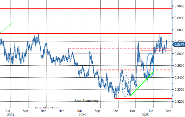 Het pond won gisteren heel beperkt terrein terug na de rente-uppercut (LT risicopremies) eerder deze week. Toch blijft de hogere rente (lang, maar ook kort) een risicopremie. Dat is niet per se een steun voor de Britse munt. Zeker in de aanloop naar een moeilijke begrotingsopmaak, blijft het pond kwetsbaar. Minister van Financiën Reeves gaf in dit verband gisteren aan dat ze de nieuwe begroting op 26 november voorstelt. Een nieuwe aanval op de technische weerstand EUR/GBP 0.8769 (zie grafiek) is waarschijnlijk een kwestie van tijd.