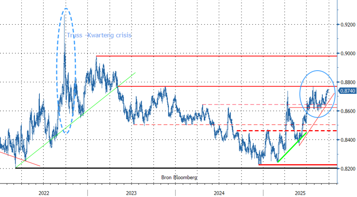 Ook wat de begroting en de overheidsfinanciën betreft kwam er recent vooral slecht nieuws. Eind vorige week waren de maandelijkse begrotingscijfers (augustus) nog maar eens aanzienlijk slechter dan verwacht. Deze week bleek dan weer dat de interesse van investeerders bij de veilingen van Brits overheidspapier taant. De rentes stegen daarop, maar dit soort hogere risicopremies is uiteraard geen steun voor het pond. Twee eerdere pogingen dit jaar om de zone EUR/GBP¨0.8740/69 te slopen mislukten. Met een aartsmoeilijk begrotingsdebat in de aanloop naar de beleidsverklaring door minister van Financiën Reeves eind november, is de vraag toch WANNEER eerder dan OF de breuk er komt.