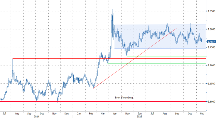 De Australische (rente)markten trekken alvast hun conclusie. De 3-j overheidsrente spurt 10 bpn hoger tot 3.8%. Ter vergelijking: minder dan een maand geleden schreven we nog 3.3%. De markt ziet nu nog slechts een kans van iets meer dan 30% op een laatste renteknip volgend jaar. Begin deze week was dat nog 2/3 kans. Een maand geleden rekende de markt zelfs nog op 2 bijkomende stappen van 25 bpn. De Aussie dollar zet zijn herstel voort. AUD/USD klimt naar 0.656. EUR/AUD valt beneden 1.77 (1.766). Naast een positief renteverhaal profiteerde de Aussie dollar recent ook van de relatieve ontspanning in de handelsrelaties tussen China en de VS. Naast de binnenlandse economische en monetaire ontwikkeling blijft de Aussie dollar gevoelig voor het algemeen risicosentiment. Zolang dat constructief blijft, is de Australische munt waarschijnlijk goed ondersteund. In de AUD/USD-combinatie is de septembertop op 67.07 de eerste belangrijke referentie op de grafieken. EUR/AUD nadert de bodem van een enge handelsband tussen 1.815 & 1.75. In geval van een breuk, komt de low van mei (top voor de Aussie) nabij 1.725 op de radar.