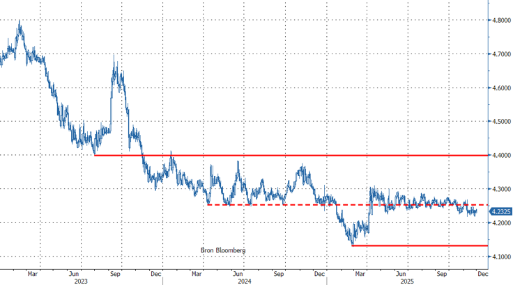 De Banco Central do Brasil en de Bank of Japan kennen een duidelijk afwekende cyclus. De meeste anderen zitten kort bij het einde van de versoepelingscyclus of minstens in de ‘fine-tuning-fase’. Tot de laatste behoort ook de Poolse centrale bank (NBP) die woensdag haar beleidsverdict bekend maakt. Na een lange pauze tussen oktober 2023 en mei van dit jaar ging het beleidscomité van gouverneur Glapinski dit jaar dan toch uiteindelijk overstag en verlaagde de rente in vijf stappen van 5.75% tot 4.25% nu. Na de verlaging begin vorig maand zag het er nog naar uit dat het mogelijk tijd was voor een pauze om de impact van de versoepeling eerder dit jaar te evalueren. Het inflatiecijfer voor de maand november dat vrijdag bekend werd gemaakt dook echter onverwacht beneden de 2.5% (+/- 1%pt) NBP-doelstelling. (0.1% m/m en 2.4% j/j van 2.8% j/j). Dit is mogelijk voldoende voor de NBP om het beleid ook deze maand iets meer richting neutraal te brengen (tot 4%). De zone 3.5% tot 4% wordt begin volgend jaar dan mogelijk de ‘landingszone’ voor de NBP-beleidsrente. De zloty was, afgezien van de risk-off correctie naar aanleiding van Trump’s aankondigingen op Liberation Day, een oord van stabiliteit dit jaar. EUR/PLN (4.236) noteert nu aan de ‘sterke’ kant van de nauwe EUR/PLN 4.22/4.31 handelsband. Dat kan, gezien de nog steeds mooie reële rente, nog even zo blijven.