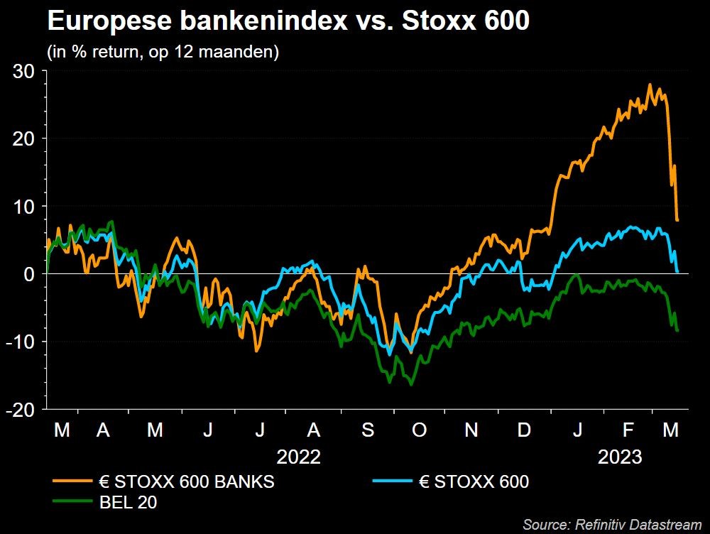 De adempauze van de voorbije weken was van korte duur, want gisteren werd een dag in het teken van de vrees dat Credit Suisse om kapseizen staat. En die vrees sleurde alle banken mee, maar vanmorgen zijn de Europese aandelenbeurzen tenminste al weer beter gezind. De problemen van Credit Suisse zijn niet nieuw, want het aandeel daalt in essentie al 10 jaar, met een versnelling sinds april 2021. Maar het faillissement van SVB en Signature Bank hebben deze terugkerende angsten opnieuw aangewakkerd. Vandaag is er opluchting, dankzij een lening van de Zwitserse nationale bank.