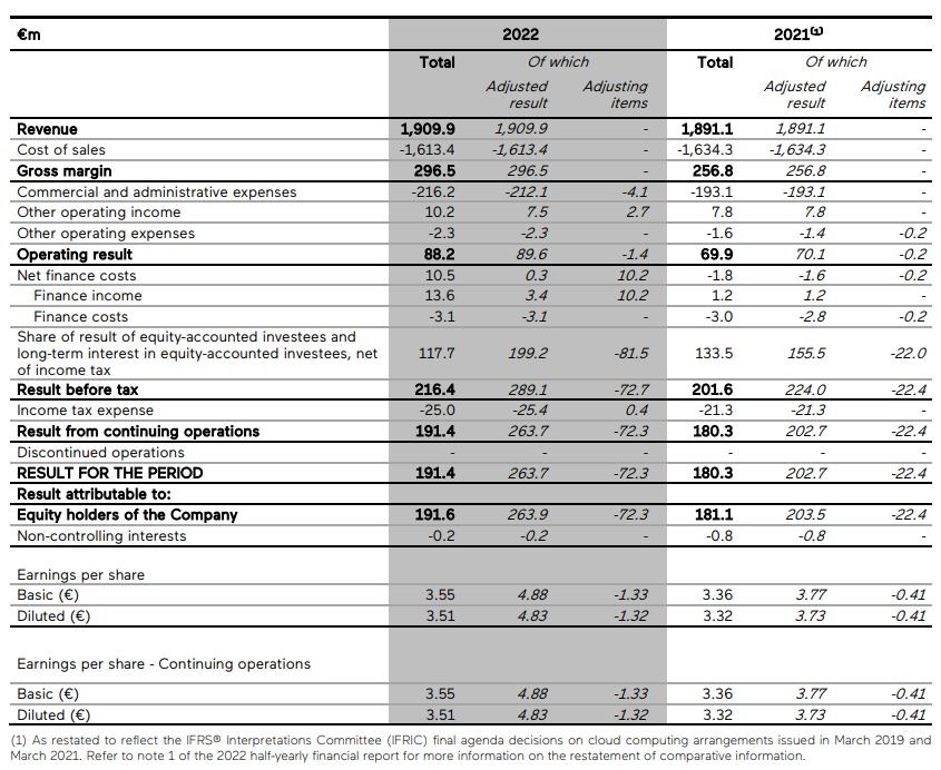 - Belron: De omzet steeg met 18,8%, waarvan 13,3% op autonome basis, tot 2,76 miljard euro. Dat leverde een bedrijfswinst op van 495,9 miljoen euro en een marge van 18%, wat ver boven de verhoopte 478 miljoen euro lag. De positieve verrassing was deels het gevolg van enkele herclassificaties, maar dat mag de pret niet deren. De nettoschuld bedraagt 3,8 miljard en dat cijfer bleef min of meer stabiel ten opzichte van 2021.