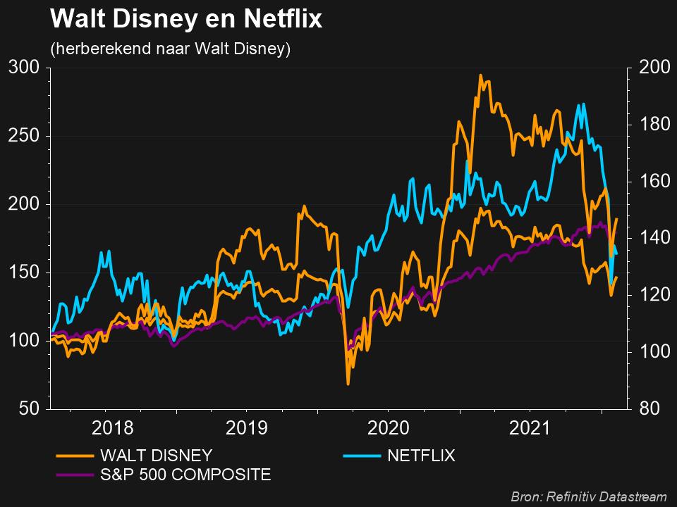 Bij Walt Disney kwamen omzet, winst én de groei van het aantal streamingabonnees in het eerste kwartaal ruim boven de analistenverwachtingen uit, onder meer omdat de pretparken van de groep de cijfers extra glans gaven. De winst van 1,06 dollar was bijna dubbel zo hoog dan gedacht (57 cent), de omzet steeg met 34% tot 21,82 miljard dollar (verwacht: 20,91 miljard dollar) en het voegde 11,8 miljoen Disney+ abonnees toe tot 129,8 miljoen stuks (129,2 miljoen verwacht). Tegen 2024 wil de groep 230 à 260 miljoen streaming abonnees opgetekend hebben. En dat zien beleggers duidelijk zitten