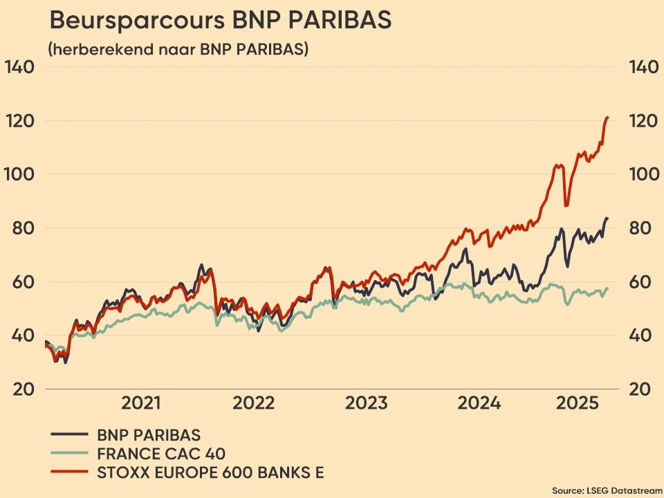 Het aandeel presteerde in 2024 ver onder de Europese bankbenchmark (SX7E). De bankbenchmark steeg meer dan 15% terwijl BNP Paribas meer dan 10% verloor. De twee voornaamste redenen voor de zwakkere beursprestatie zijn politieke onzekerheid in Frankrijk en een lager dan gemiddelde winstgroei in 2024. De politieke onzekerheid blijft duren, maar we merken op dat BNP Paribas een Europese bank is dat ook buiten Frankrijk uitgebreid netwerk aan activiteiten heeft. De hoger dan gemiddelde winstgroei voor 2025 en 2026 moet voortvloeien uit de recente overnames van Axa Investment Managers en HSBC Private Banking Duitsland. Daarnaast loopt er ook een kostenbesparingsprogramma dat de financiële efficiëntie van de groep moet verhogen. Een normalisering van de rentecurve zou ook de winstgevendheid moeten vooruithelpen.