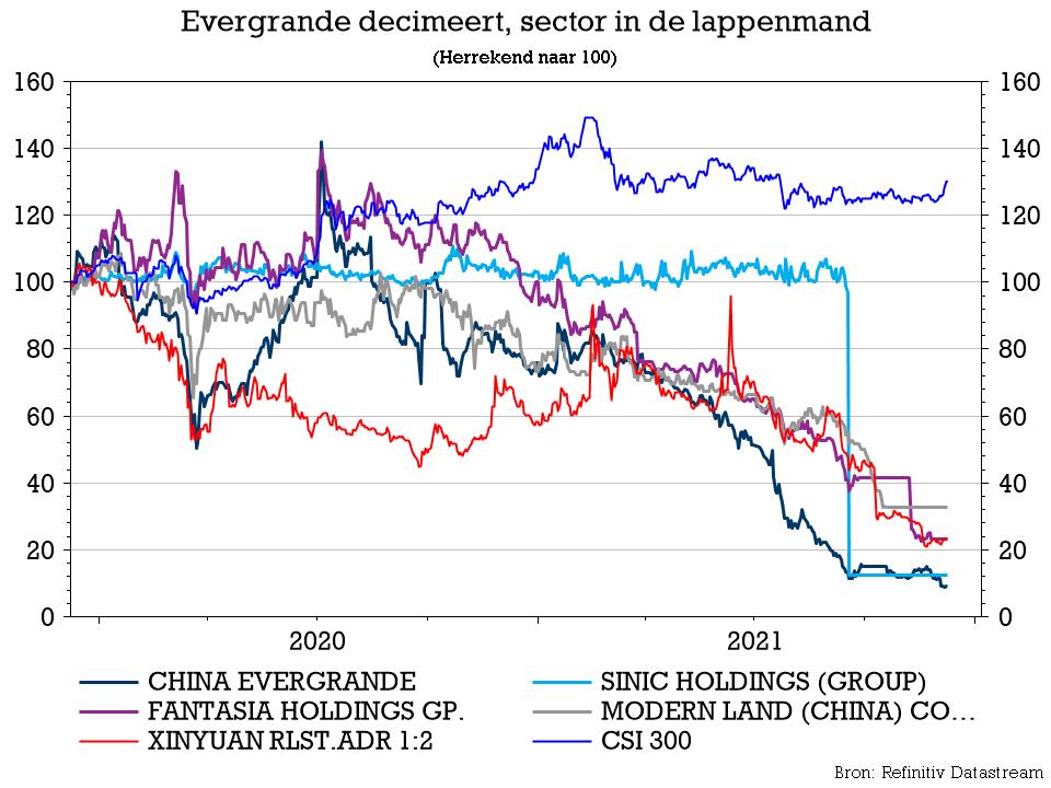 - Eind vorig jaar kwam China’s Centrale Bank met het zogeheten “drie rode lijnen”-beleid. Dat zijn regels die vastgoedbedrijven voorschrijven dat ze hun schulden eerst moeten terugbrengen voordat ze nieuwe leningen bij de banken kunnen aangaan. Het nieuwe beleid had en heeft tot doel om de stijging van de huizenprijzen onder controle te krijgen en om huizen van betere kwaliteit te bouwen. De Chinese toezichthouders traden zo veel harder op dan voorheen om in eerste instantie de roekeloze leengewoonten van projectontwikkelaars te stoppen. Dit heeft Evergrande gedwongen om nieuwe financiering te zoeken, door een deel van zijn uitgestrekte zakenimperium te verkopen. Dat proces verloopt echter bijzonder stroef, terwijl ook de activiteiten op het gebied van elektrische voertuigen de deur niet uitgeraken. Een groep in nood trekt wel potentiële kopers aan, maar die wachten vaak tot het water over de lippen staat, eerder dan ertegen.