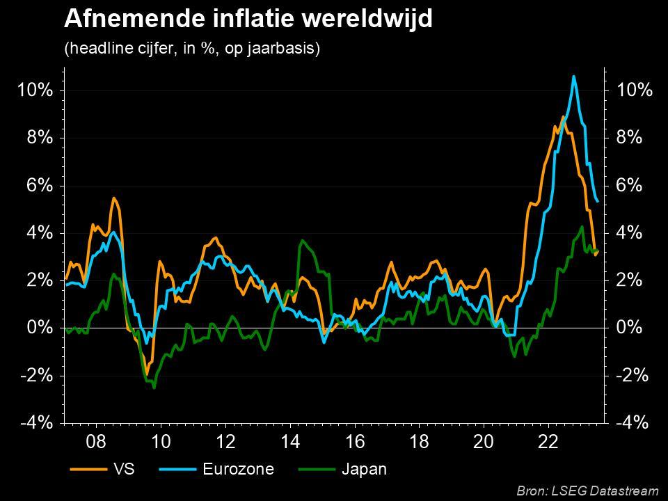 Feit is ook dat een renteverhoging in Europa nog steeds tot de mogelijkheden behoort. Aan de andere kant is de onzekerheid over de beslissing tijdens de volgende vergadering quasi totaal; het kan werkelijk alle richtingen uit en dat is zichtbaar bij de “bookmakers”: terwijl voor de Fed de kans op een pauze op 80% geschat wordt, is dat voor de ECB zo’n 40% à 50%.