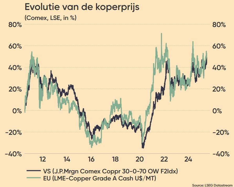 Verder stonden ook de grondstoffenaandelen natuurlijk in de kijker, nadat Trump een importtarief van 50% wil heffen op geïmporteerd koper. Heel veel impact had dat echter niet in Europa, met hoogste wat extra marktwaarde voor de sectorspelers en een stabiele Europese koperprijs. De Amerikaanse producenten varen er wel goed bij, bijvoorbeeld Freeport McRoran, onder meer omdat de Amerikaanse koperprijs (Comex) op twee dagen tijd zo’n 10% duurder werd.