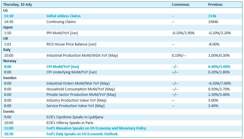 De economische kalender heeft opnieuw weinig om het lijf. Zo zorgt de VS de wekelijkse update van de nieuwe werkloosheidsaanvragen, maar vooral de speeches van Musalem en Daly, beide Fed-directeurs, verdienen aandacht. De evolutie van de Japanse producentenprijzen is eveneens interessant, terwijl de Britse huizenprijzen en de Italiaanse en Zweedse industriële productie iets minder van belang zijn. Dat kunnen we niet zeggen van de Noorse consumenteninflatie over juni, want die kan de Noorse kroon danig doen bewegen.