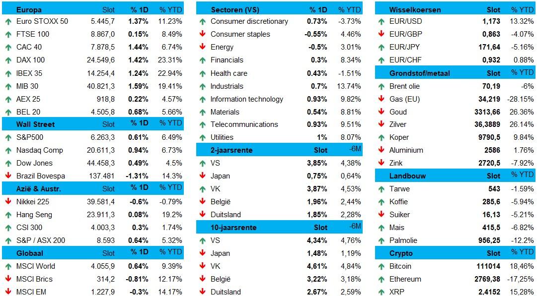 De Europese aandelen waren meer dan gewoon goed gezind, met op kop de defensieaandelen en de financiële sector. Het wachten op een handelsakkoord met de VS verloopt dus “ordelijk en constructief”, dus laat ons hopen dat het velletje papier ook in die optiek zal beschreven worden. De Financial Times leek al te weten dat EU-onderhandelaars aan een deal werken met hogere tarieven dan die voor het VK, met naar verluidt op maat gemaakte uitzonderingen voor sommige sectoren en bedrijven (Airbus, Duitse autofabrikanten met een Amerikaanse productie, …).