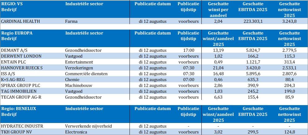 Momenteel laten de geldmarkten zien dat handelaren rekening houden met meer dan twee renteverlagingen tegen december, met een waarschijnlijkheid van ongeveer 90% dat de Fed volgende maand de rente met een kwart procentpunt verlaagt. Eind juli hebben beleidsmakers de rente ongewijzigd gelaten. De kernindex van de consumentenprijzen (CPI) in de VS, die wordt beschouwd als een maatstaf voor de onderliggende inflatie omdat deze de volatiele voedsel- en energiekosten buiten beschouwing laat, zal volgens de mediane prognose in een Bloomberg-enquête onder economen voor juli een stijging van 0,3% laten zien.