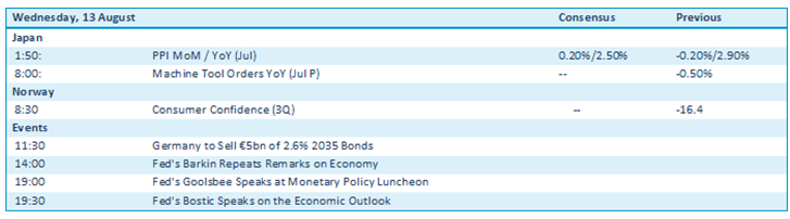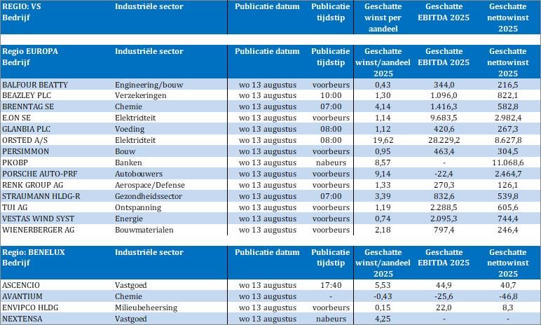 De Amerikaanse markten stegen fors toen de CPI (inflatiecijfers) voor juli lager uitkwam dan gevreesd: +2,7% op jaarbasis, onder de gemiddelde verwachting van ~2,8%. De kern-CPI (exclusief voedingsmiddelen en energie) steeg met 3,1% op jaarbasis, het hoogste niveau sinds februari, maar nog steeds binnen een beheersbaar bereik. De markten interpreteerden de gegevens als een ondersteuning voor een renteverlaging door de Fed in september.