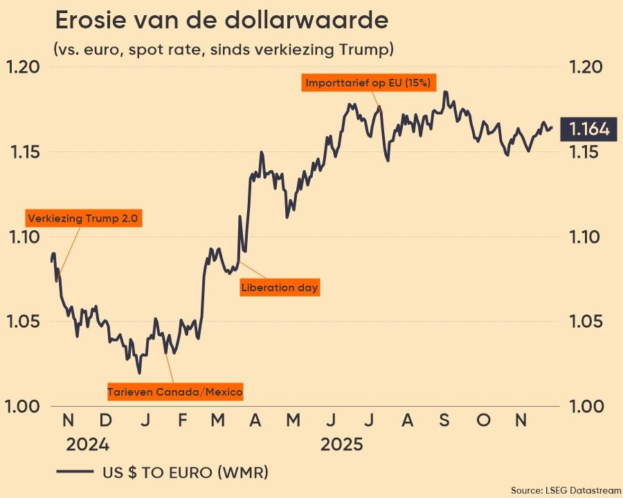 De groeiende verwachting dat de Fed-cyclus echt wel op zijn einde loopt, blijft de dollar een pootje lichten. De munt handelt op het laagste peil in 15 maanden (€1 = $1,1231) na een steile duik vannacht. Ook de dollarindex, die de Amerikaanse munt meet ten opzichte van zes belangrijke rivalen, noteert op 99,71, het laagste peil sinds april 2022. Dat wil zeggen dat Europese bedrijven die handel drijven in dollar minder centen zullen krijgen voor hun goederen, terwijl Amerikaanse exporteurs net gesubsideerd worden. Zeker bij zo’n forse beweging is het daarom oppassen voor de impact op de winst- en verliesrekeningen de komende kwartalen.
