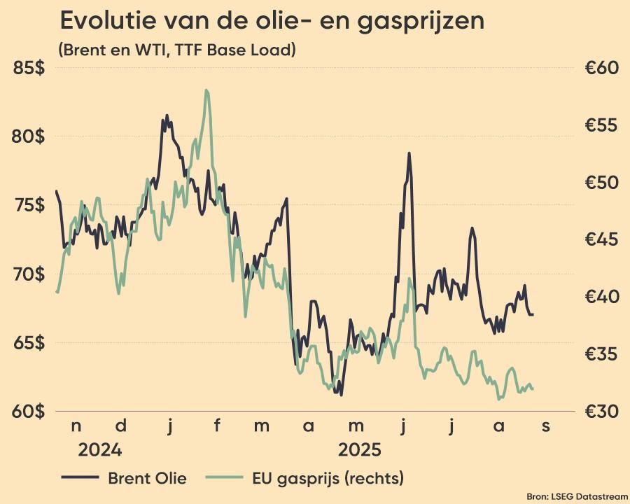 Eén en ander is niet zonder gevolg, want de geleidelijk gedaalde olieprijs was een belangrijke factor in het Europese desinflatoire proces, en dus in de these dat de ECB de rente nog eens kan verlagen tot 1,75%. En het zet ook het groeipotentieel wat onder druk, waardoor het stagflatiespook zich blijft roeren. Een zeer ongemakkelijke mix voor centrale bankiers, dus, Op de rentemarkt is de extra laag van onzekerheid vooralsnog geen aanleidig om aan de rente te morrelen. Integendeel, zelfs: de blijven nog wat meer aan de zijlijn staan tot er duidelijkheid is omtrent de effectieve impact. De Duitse 10-jaarsrente bleef stabiel op 2,52%, tegenover een evenzeer stabiel 4,44% in de VS, zodat ook de dollar een snipperdag nam (€1 = $1,1558).