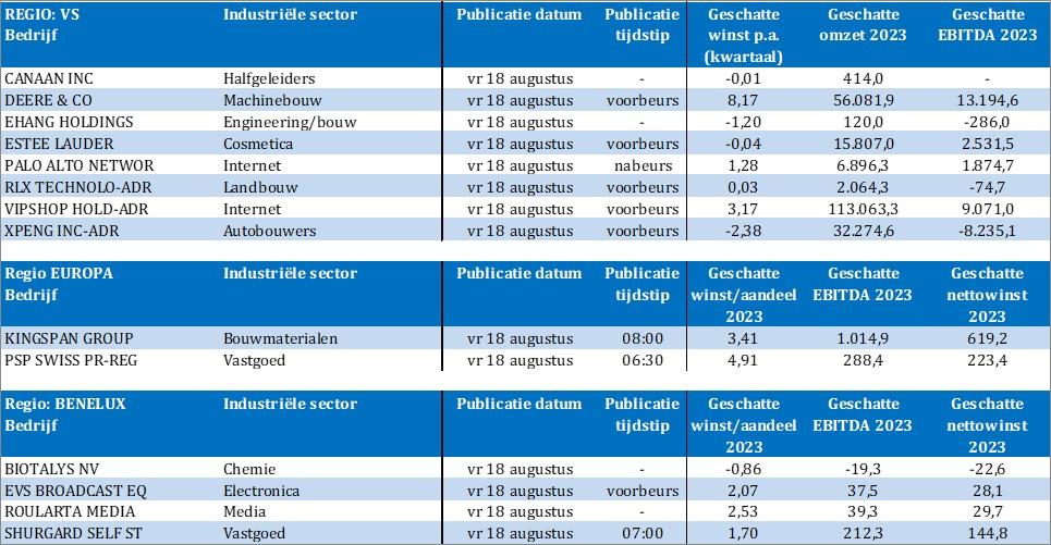 Op de macrokalender kunnen we voor vandaag de Japanse inflatiecijfers afvinken en resten nog de Europese tegenhangers. In het VK is het uitkijken naar de kleinhandelsverkopen. Op de bedrijvenkalender is het ook geen overrompeling en krijgen we bij het ontbijt in Brussel onder meer de cijfers van Roularta, EVS, Biotalys en Shurgard voorgeschoteld. Ook Kingspan komt met cijfers die interessante lectuur kunnen vormen voor Recticel. Na de lunch serveren Estee Lauder en Palo Alto de cijfers.