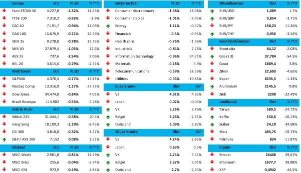 Tegen al het rentegeweld was op de aandelenmarkten geen kruid opgewassen. Vooral Big Tech betaalde andermaal de rekening, maar ook in healthcare werden flink wat rode cijfers opgetekend. Beter nieuws was er voor de energiesector die hoger ging en garen wist te spinnen uit de gestegen olieprijs. De prijs voor een vat Brent dikte met 8 dollarcent aan tot 84,12 dollar en de WTIT steeg met 22 dollarcent tot 80,61 dollar. Op weekbasis kijkt het zwarte goud echter tegen een verliesbeurt aan. De verzwakkende Chinese economie en de vrees voor verdere renteverhogingen in de VS wegen immers zwaarder door dan indicaties van krapper wordende wereldwijde voorraden.