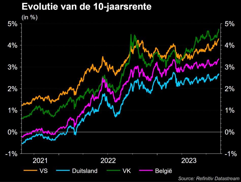 Terwijl op Wall Street de belangrijkste indices opnieuw een verliesdag op het bord schreven (Dow Jones -0,8%, S&P500 -0,8% en Nasdaq -1,2%) ging de meeste aandacht gisteren vooral uit naar de obligatiemarkten waar de rendementen op bijvoorbeeld 10-jaarspapier niveaus bereikten die sinds 2008 niet meer werden gezien. De notulen zinderden een dag na publicatie duidelijk nog na, waarbij vooral de gestipuleerde vrees voor inflatierisico’s de mantra “hoger voor langer” de rentes hoger stuwde. Een en ander werd nog eens extra in de verf gezet met een portie macro-economische indicatoren die gisteren werden gepubliceerd. Zo klom de vertrouwensindicator van de Philadelphia Fed onverwacht van -13,5 naar +12 in augustus, terwijl slechts op een verbetering tot -10 was gerekend. Ook de arbeidsmarkt ondersteunde de daling van de wekelijkse werkloosheidsaanvragen de these van een sterkere Amerikaanse economie. .