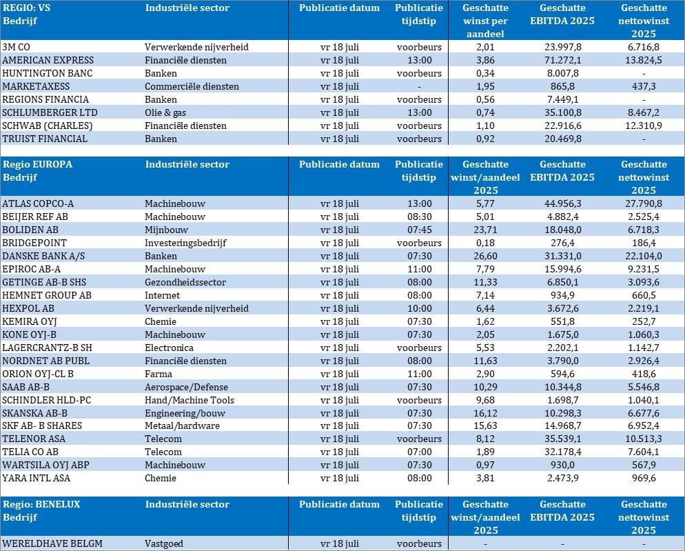 Bedrijfsresultaten American Express, Market Axess, Schlumberger, Charles Schwab, Truist Financial, 3M, Atlas Copco, Beijer, Boliden, Bridgepoint, Danske Bank, Epiroc, Hexpol, Kone, Saab,Skanska, SKF, Telenor, Telia, Yara en Wereldhave Belgium.