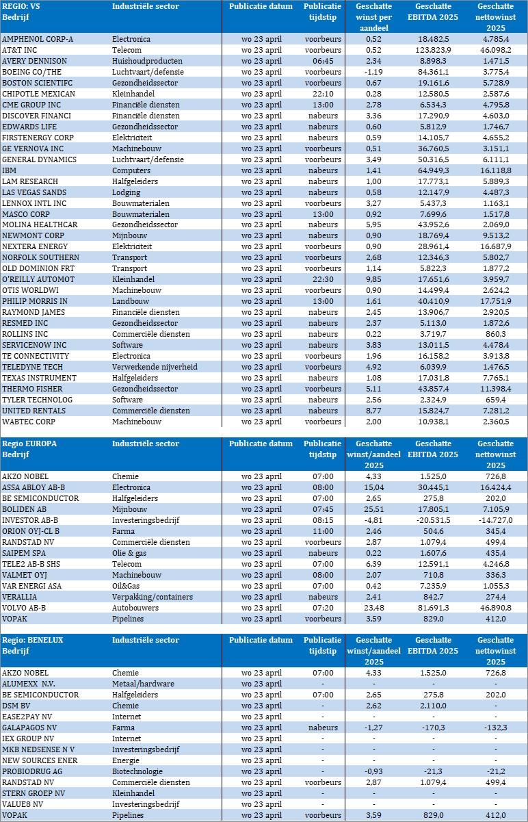Ook qua bedrijfsresultaten wordt het razend interessant, want er is al meteen lawinegevaar. De lijst van bedrijven die de boeken over het eerste kwartaal openen is eveneens een belangrijke graadmeter voor de onderliggende gang van zaken met betrekking tot voorraden, marges, kosten, etc … Neem er chips en popcorn bij en zet u schrap!