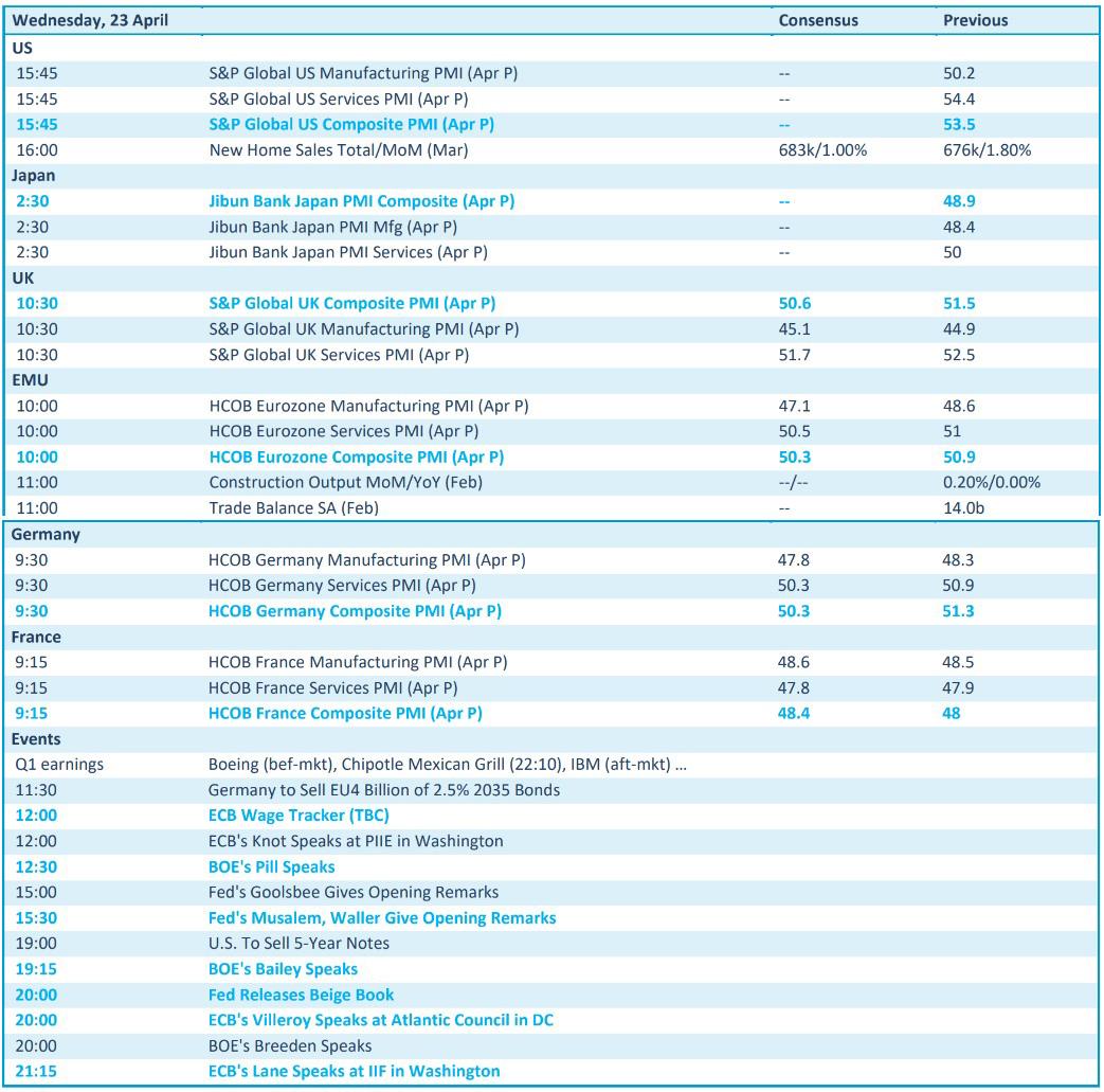 Er staan vandaag belangrijke sentimentsdata op het economische menu. Die data komen van S&P Global, HCOB, Jibun en geven inzicht in de maakindustrie en de dienstensectoren, zowel in de VS, Japan, het VK, EU, Duitsland, Frankrijk, etc. Ze geven de eerste inzichten na de "tariff scare", dus dalingen worden de norm. Verder speecht de halve ECB en Fed, al zullen die niet meer zeggen dan wat frontvrouw- en man Lagarde en Powell de voorbije dagen en weken al hebben meegedeeld.