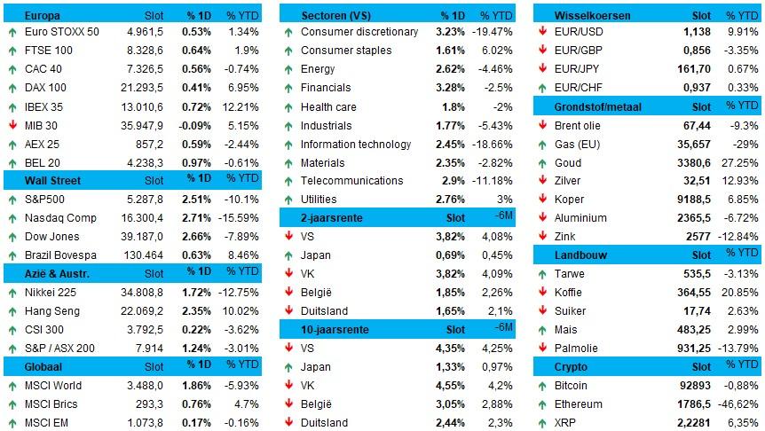 Wall Street weer op winst (+2,6%) want - dit verzin je natuurlijk niet zomaar - president Trump is dan toch NIET van plan om Fed-topman (en "grote verliezer") Powell te ontslaan. Dat nieuws werd nabeurs meegedeeld en houdt een scherpe bocht in ten opzichte van de recente retoriek tegen de man. Daarnaast zorgde ook minister van Financiën Bessent voor wat sfeer, want de VS blijft zowaar een "de-escalatie" in de handelsoorlog met China na te streven, want de Trump-administratie is er “niet op uit om de twee grootste economieën ter wereld te ontkoppelen”. De importtarieven zouden “aanzienlijk” kunnen dalen bij een deal, maar wel niet tot nul.