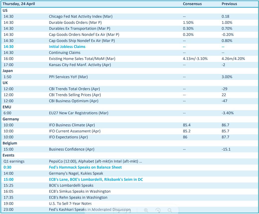 Het zwaartepunt van de economische kalender bevindt zich in Duitsland, waar we een update krijgen van de betrouwbare, en dus belangrijke, IFO-indicator voor april. De VS zet daar de wekelijkse update van de nieuwe werkloosheidsaanvragen tegenover, naast een inzicht in de bestellingen voor duurzame goederen en de Chicago Fed index. Ook interessant zijn de Europese cijfers over de autoverkoop en het Belgische zakelijke vertrouwen over april, al wegen die té licht om het sentiment te maken.