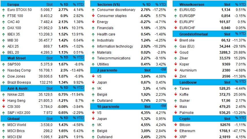 De Europese beurzen kenden een sterke dag, in lijn met de reactie van de Aziatische markten op alweer een “knippermoment” van president Trump. Plots mag Fed-topman Powell wél aanblijven, nadat de minister van Financiën Bessent eerder al aangaf dat er gewerkt wordt aan een deal met China. En na het sluiten van de Amerikaanse beurs kwam er alweer goed nieuws, want een deel van de recente ingestelde tarieven op auto-onderdelen zou ook in de ijskast gestoken worden.