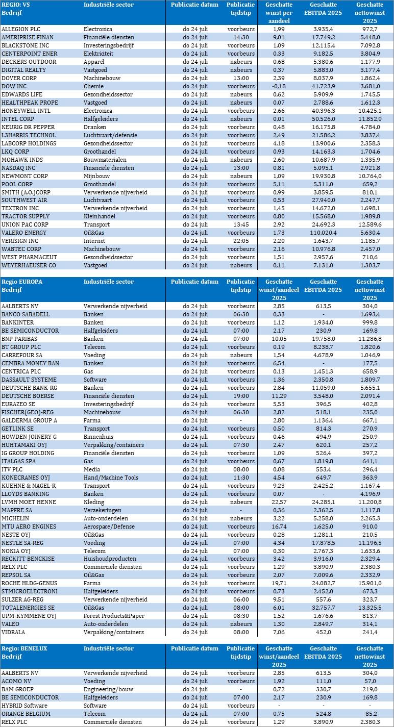 Bedrijfsresultaten krijgen we vandaag in groten getale, onder meer van Blackstone, Digital Realty, Dow, Edwards Life Sciences, Intel, Nasdaq, Newmont, Textron, Aalberts, Banco Sabadell, Bankinter, Besi Semiconductor, BNP Paribas, Carrefour, Deutsche Bank, LVMH, Michelin, Nestle, Nokia, Relx, STMicroelectronics, Total Energies, Hybrid Software en Orange Belgium.