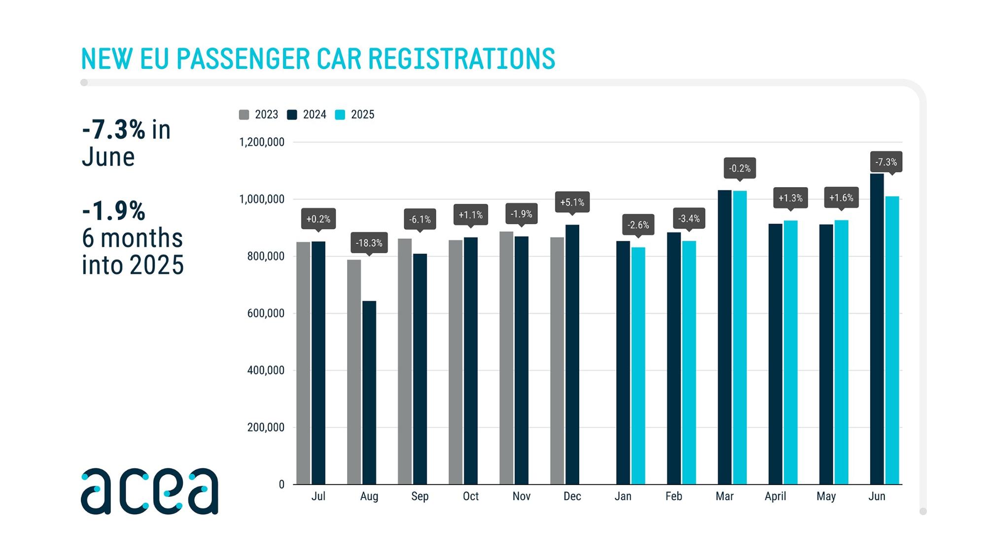 Over naar de Europese automarkt. Het aantal inschrijvingen van personenauto's daalde in juni met 7,3% op jaarbasis tot 1,01 miljoen stuks, na een stijging van 1,6% in mei. Het gaat om de eerste daling sinds april, al is de cijferreeks altijd nogal volatiel. De verkoop daalde in de vier grootste Europese markten: België (-16,4%), Duitsland (-13,8%), Spanje (-45,2%) en Italië (-34,4%). Wel was er groei in het segment van de batterij-elektrische voertuigen (BEV) (+7,8%), met groei in Spanje (+103,2%), Duitsland (+8,6%) en Nederland (+6,4%).
