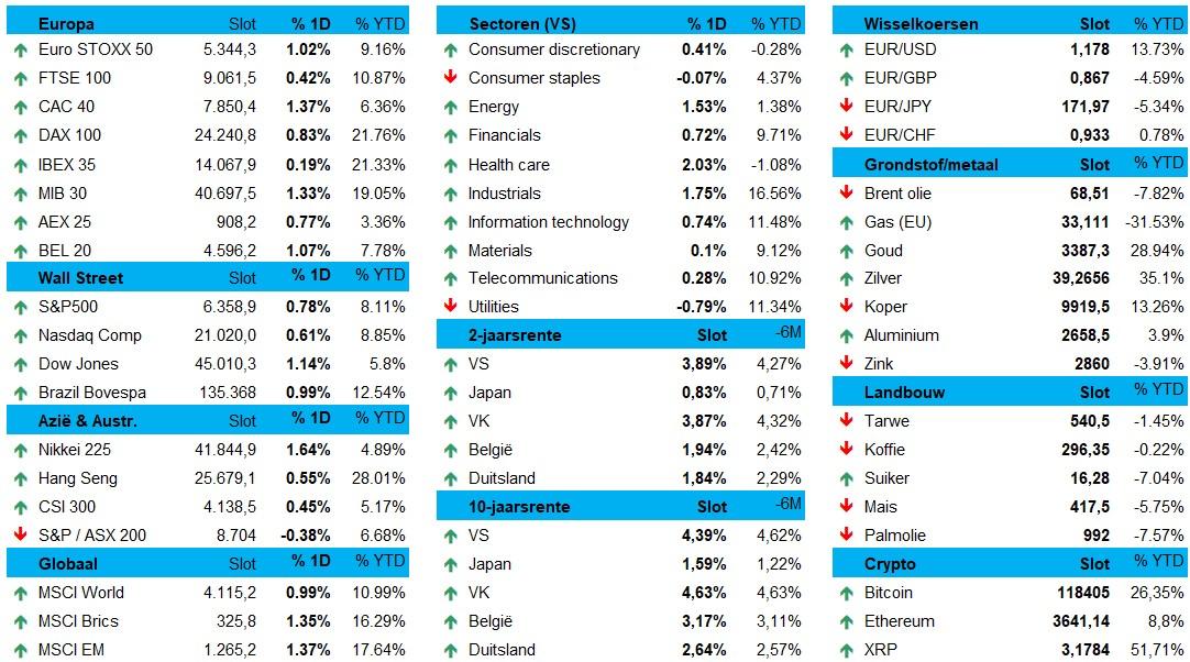 Op de brede markt noteren we vooral dat de recente dollarstijging alweer ten einde lijkt (€1 = $1,1763), met name omdat de Duitse rente een forse 7 basispunten aantrok tot 2,67% en zo het verschil met de Amerikaanse 10-jaarsrente (4,4%) verkleinde. Ook de 2-jaarsrente steeg duidelijk in Duitsland (tot 1,85%), tegenover een stabiele 3,9% in de VS). De goudprijs daalde 0,3% tot 3.375 dollar per ounce, terwijl de bitcoin 0,8% daalde tot 117.574 dollar.