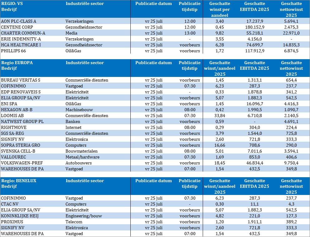 Bedrijfsresultaten komen er van Aon. Centene, Charter Communications, Erie Indemnity, HCA Healthcare, Phillips66, Bureau Veritas, EDP Renovaveis, Elia, Eni, Hexagon, Loomis, Natwest, Rightmove, SGS, Signify, Sopra, Steria, Vallourec, Volkswagen, WDP, Cofinimmo, Ctac, Heijmans, Proximus en Signify. Maar na dit dagje verteren, volgt het weekend. En dat mag al eens zo, zo één keer per week.