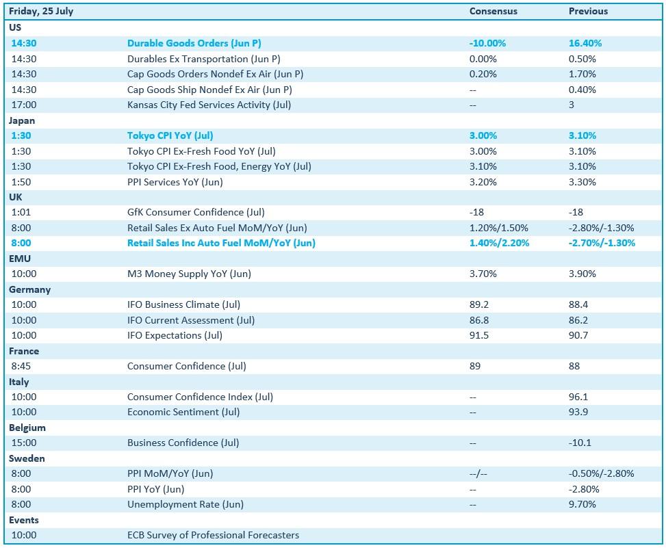 Er staan een pak interessante cijfers op het menu, dus hou vast aan de takken van de mast. De VS levert een update van de bestellingen voor duurzame goederen over juni, terwijl het VK de consument in de kijker zet via de kleinhandelsverkoop in juni. Die kan mogelijk met 2,2% aantrekken. Ook Frankrijk en Italië focust op de “kleine man” met een update van het consumentenvertrouwen over juli. Zowaar nóg belangrijker is de Europese M3 geldhoeveelheid over juni en al zeker de Duitse IFO-indicator over juli. Daartegen verdwijnt het Belgische zakelijke vertrouwen in het niet.