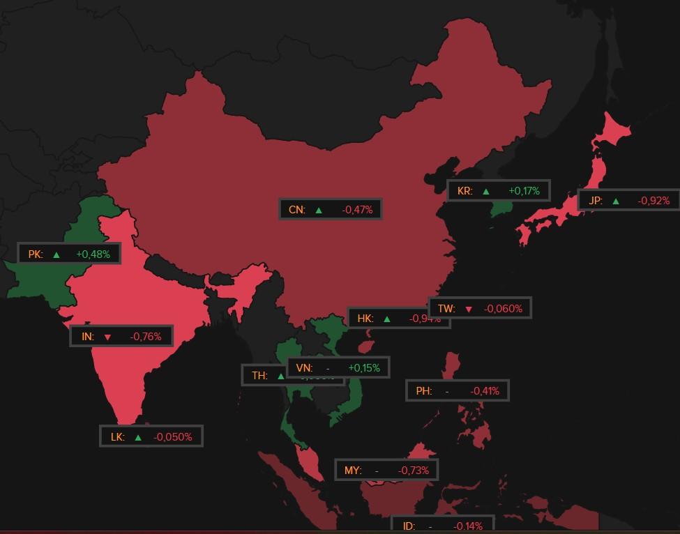 Azië ging vannacht de week in mineur uit, met overwegend rode cijfers: China -0,5%, Hongkong en Japan -1%, India -0,7%. Winstnemingen, zullen we zeggen, met op de achtergrond een inflatiemeevaller in Japan en een drukke tariefweek op komst De VS en China ontmoeten elkaar bijvoorbeeld in Stockholm om de deadline van 12 augustus te snel af te zijn.