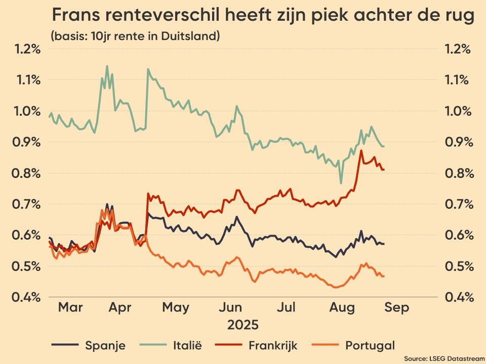 De Duitse rente daalde ondertussen weer, zowel op 2 jaar (2,1%) als op 10 jaar (2,16%). Maar dat verhult het feit dat het verschil tussen de Franse en de Duitse rente (de zogenaamde “spread”) opnieuw toenam tot het hoogste niveau sinds 2017. Dat komt omdat beleggers een extra risicopremie eisen door de fiscale puinhoop in Frankrijk en het onvermogen van een zwakke coalitieregering om daar iets aan te doen. De spread bedraagt nu zo’n 78 basispunten, een zucht onder de spread van het traditioneel zwakke Spanje (80 basispunten) en ver boven de Portugese spread van 65 basispunten.