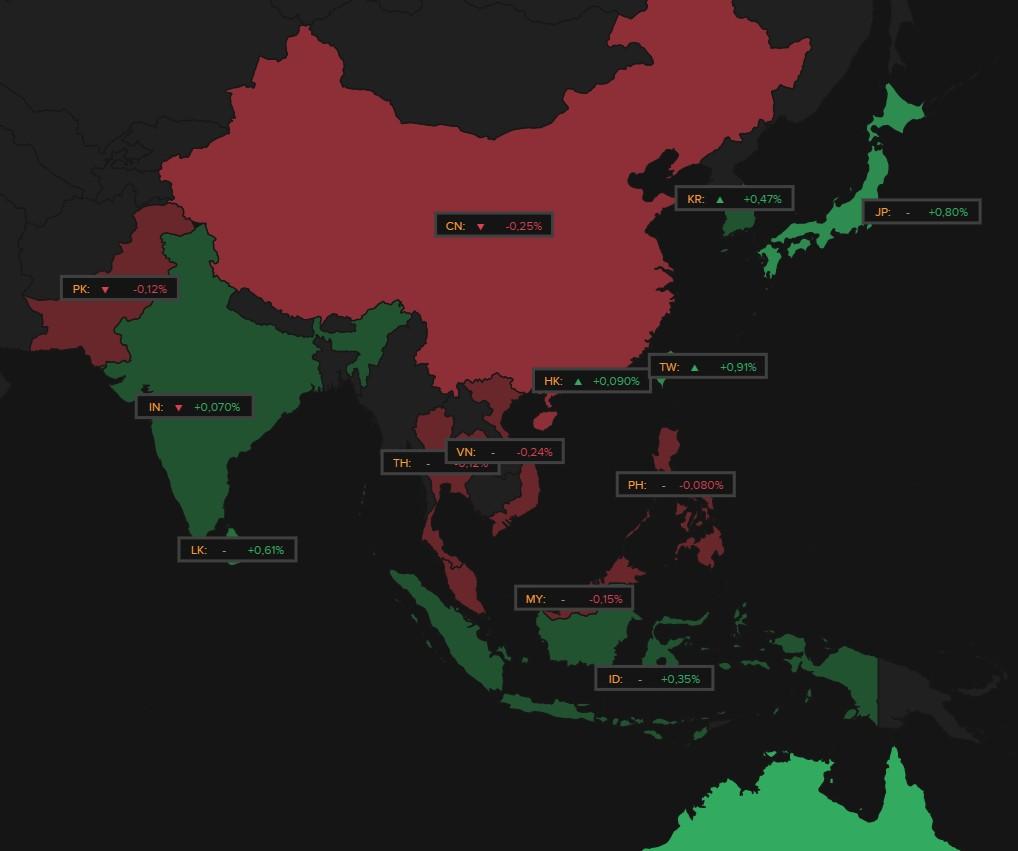 In Azië hield de algemeen teneur daarom ook aan: Japan hield de deuren dicht, zodat Hong Kong (-0,1%), Zuid-Korea (+0,45%), Taiwan (+1%) en India (+0,2) zowat alle kanten opgingen.