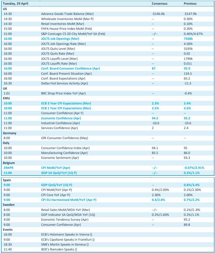 De economische kalender is aardig opgevuld, met onder meer een heel belangrijk banenrapport in de VS (JOLTS). Verder staat de consument centraal, met vertrouwenscijfers uit de VS, EU, Duitsland en Italië. En dan is er ngo de update van de Europese inflatieverwachtingen en vertrouwensindicatoren. Afkruiden doen we met eveneens belangrijke data over de evolutie van de consumentenprijzen in België en Spanje, terwijl beide landen ook BBP-cijfers over het eerste kwartaal vrijgeven.