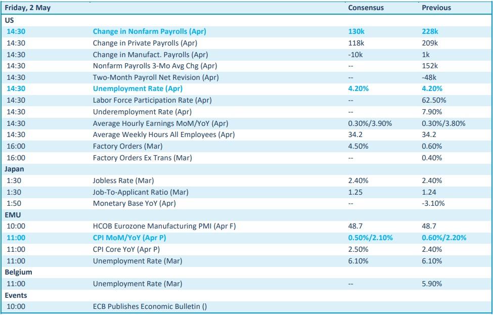 Qua economisch nieuws prijkt het Amerikaanse arbeidsmarktrapport met stip boven de rest uit. Uitkijken, dus, naar de evolutie van onder meer de uurlonen en werkloosheid in april. Daarnaast krijgen we inzicht in de fabrieksbestellingen in maart. Elders in de wereld krijgen we eveneens inzicht in de werkloosheid (EU, Japan, België), al zullen de Europese consumenteninflatiedata over april de toon veel meer kunnen zetten. Het economisch bulletin van de ECB mag daarna als kers op de taart fungeren.