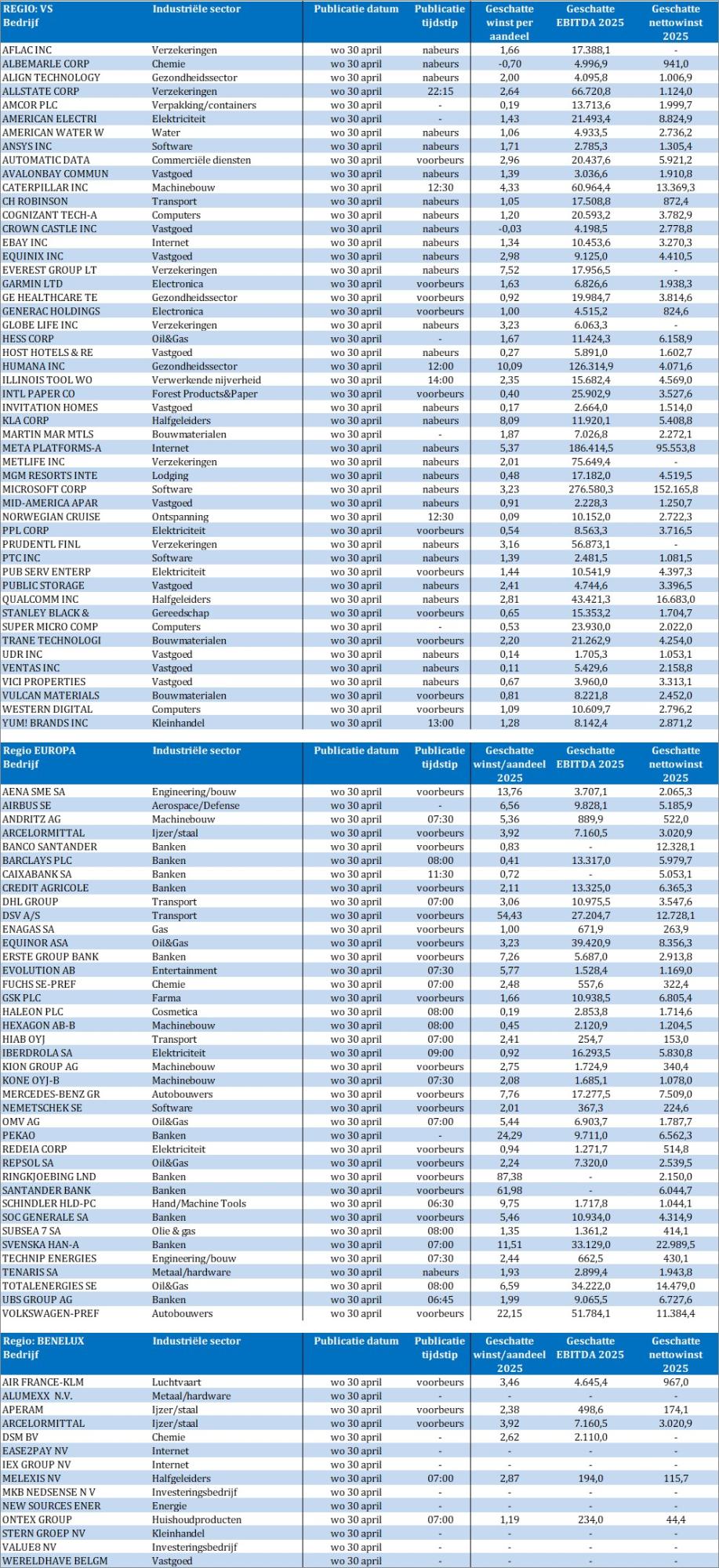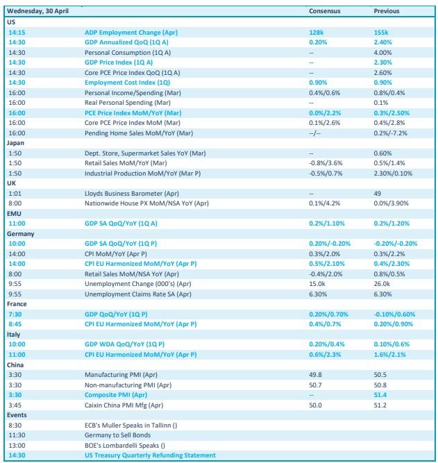 In Japan kijken we naar de kleinhandelsverkoop en de industriële productie over maart, -terwijl China een update geeft van de PMI-index over april. Het VK publiceert dan weer de altijd interessante Lloyds business barometer en zowel Europa, Duitsland als Frankrijk trakteren op een combinatielading van BBP-data (1Q) en inflatiecijfers over april.