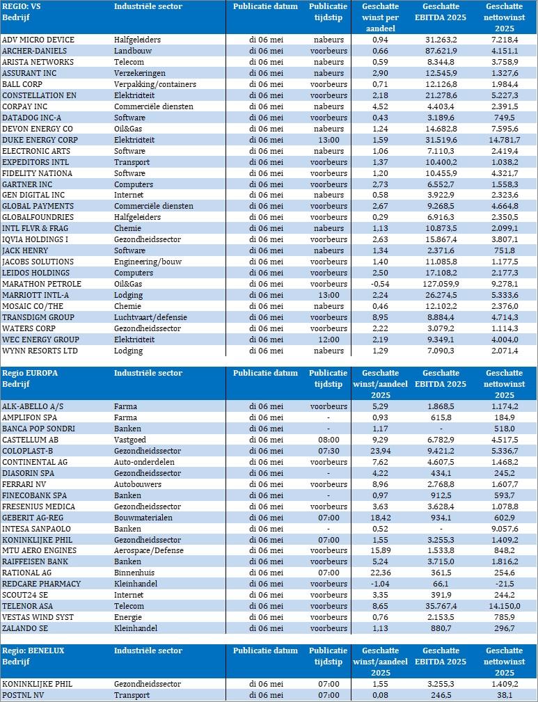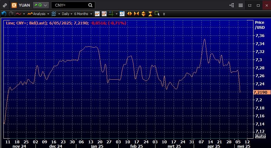 Wall Street liet gisteren zo'n 0,6% liggen, nadat de Euro Stoxx 600 afklokte met 0,3% winst. In het Oosten heropende de Chinese beurzen na de “May Day”-vakantie met 0,9% winst, in een risk-on sessie die de hele regio deed opveren, behalve India (-0,3%). Het beleggerssentiment werd gestimuleerd door tekenen van hernieuwde inspanningen tussen Beijing en Washington om de handelsspanningen te verminderen. En ook al heeft Trump “geen plannen om deze week met Xi Jinping te spreken”, een verlaging van het huidige tarief van 145% op Chinese import is wel een optie.